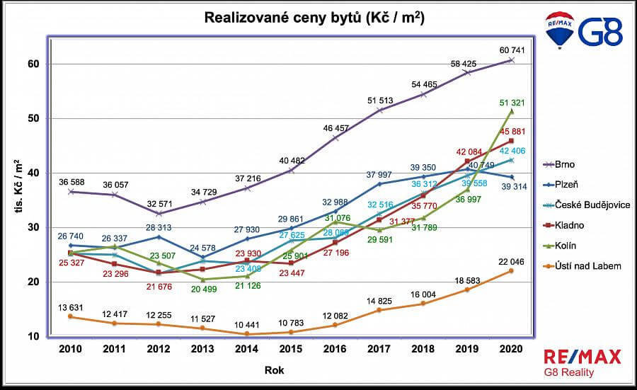 Vývoj ceny bytů v Brně, Plzni, Českých Budějovicích, Kladně, Kolíně a Ústí nad Labem